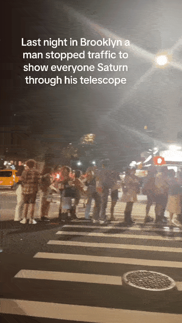 2023년 미국 브루클린에서 82세 아마추어 천문학자 조 델파우스가 길을 지나는 사람들에게 별을 보여주고 있습니다. 델피우스에 따르면 망원경을 세운 길 한복판이 토성을 관측하기 가장 좋은 위치였습니다. 다프네 줄리엣 엘리스 사회관계망서비스(SNS) 갈무리 |