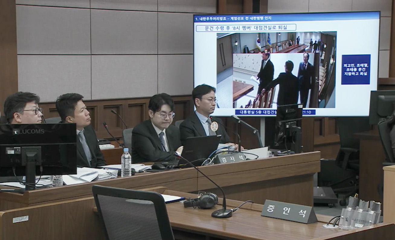 μ€μμ΄ μ λν΅λ Ήμ μ€ν 7μ42λΆμ―€λΆν°λ λν΅λ Ήμ€ μ§λ¬΄μ€λ‘ μΌλΆ κ΅λ¬΄μμλ€μ λΆλ¬ μ¬μ νλμ κ°μ‘μ΅λλ€. νλμ μ κ΅λ¬΄μ΄λ¦¬μ κΉμ©νΒ·μ΄μλ―Ό νμ μμ λΆΒ· λ°μ±μ¬ λ²λ¬΄λΆΒ·μ‘°νμ΄ μΈκ΅λΆΒ·κΉμνΈ ν΅μΌλΆ μ μ₯κ΄, μ‘°νμ© μ κ΅κ°μ 보μμ₯ λ±μΈλ°μ. νΉκ²νμ μ€ μ λν΅λ Ήμ΄ λ° μ μ₯κ΄μκ²λ ꡬμΉμ μμ© μ¬λ ₯Β·κ²μ¬ ν견 λ±μ, μ΄ μ μ₯κ΄μκ² κ²½ν₯μ λ¬Έ λ± μΈλ‘ μ¬ λ¨μ Β·λ¨μ λ±μ μ§μνλ€κ³ λ΄