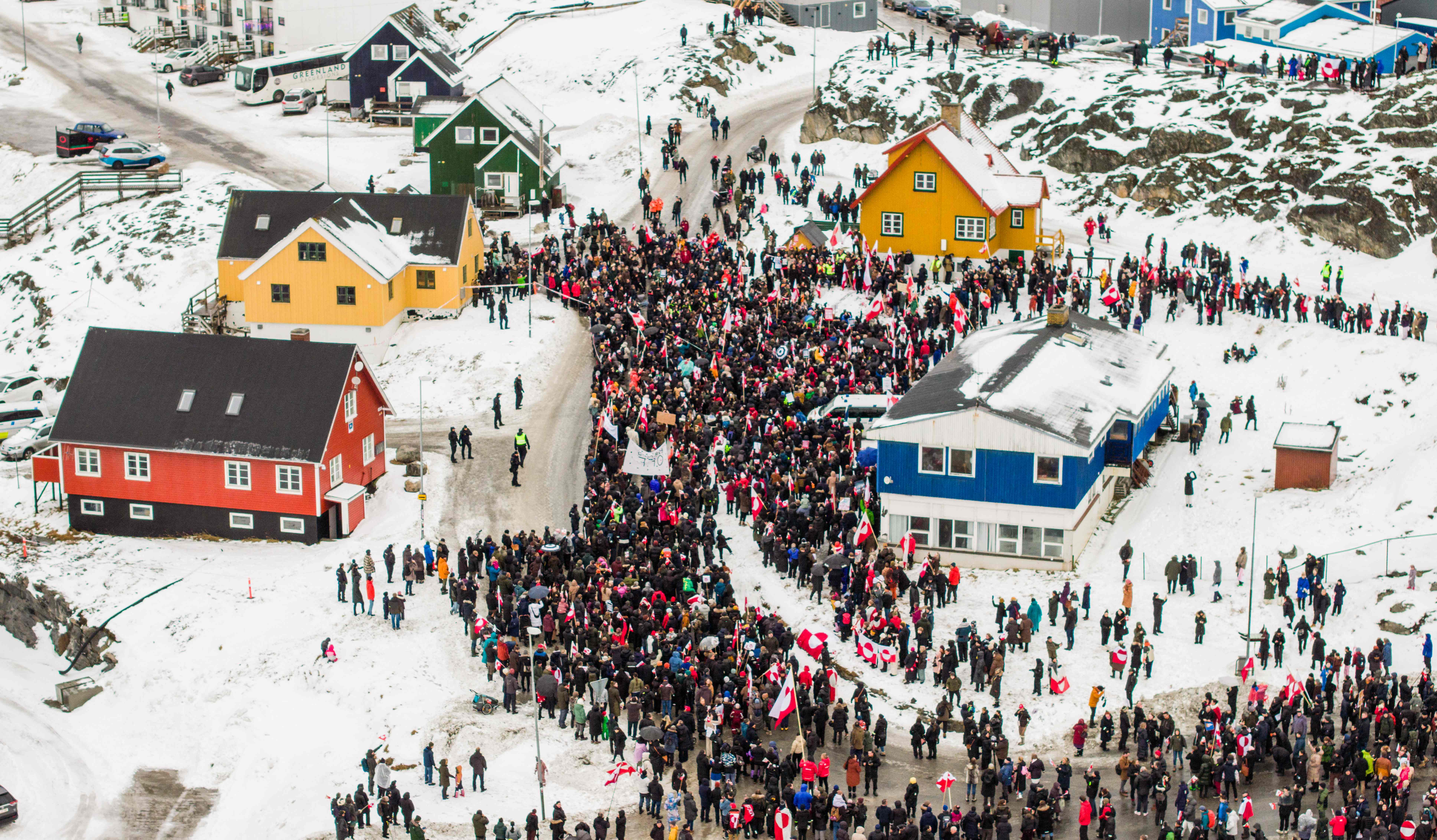 ์ด ๋ฏธ๊ตญ ๊ทํ ์์์ ์ฐธ๊ฐํ์ต๋๋ค. ์ด๋ค์ "์ํค ๊ณ ํ(Yankee go home)" "๊ทธ๋ฆฐ๋๋๋ ํ๋งค ๋์์ด ์๋๋ค(Greenland is not for sale!)" ๋ฑ ๋ฌธ๊ตฌ๊ฐ ์ ํ ํป๋ง์ ๋ค๊ณ ๋ฏธ ์์ฌ๊ด์ ํฅํด ํ์งํ์ต๋๋ค. |